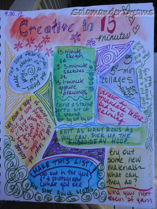 The topic this week is "creative things I could do in 15 minutes or less." This was a fun list to make, using a combination of watercolors and Pitt artist pens.